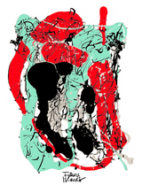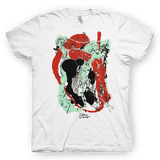 Abstract design printed on a white Gildan Softstyle t-shirt.