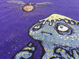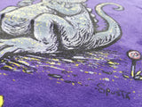 Baby dino design on a purple Anvil t-shirt. 100% cotton.