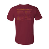 Moon Mirror Tour design printed on a maroon CV3001 Bella Canvas T-Shirt with tour dates printed on the back.